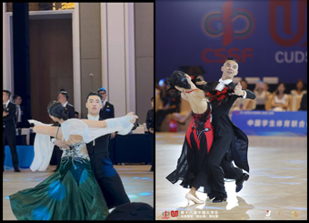 CHU Jianguo, right, LI Mengli, left, gold medalists in Viennese Waltz competition of Group B for college students (AXHU Photo)