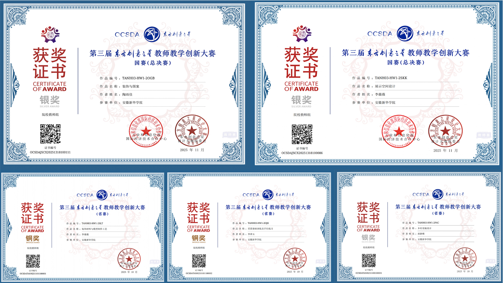 Moreover, the School’s delegation headed to 3rd Oriental Creative Star Teaching Innovation Award in Nov, 2025, and won one silver, two bronze at the national industry-level event—stressing a combination of artistic and commercial values at the same time, with that the AXHU people’s academic works have publicly showcased not only their high-end artistic tastes in the esthetic features when potentially making inroads around the world’s market, but also kinds of humanistic care with some profound insights into the ergonomic environments.
